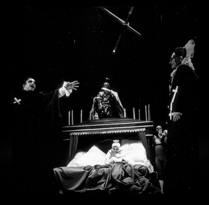 Fotografo: Manuel Martínez MuñozFecha: 10-1975Lugar: FígaroTipología: Imagen digitalSoporte: Archivo de ordenadorColor: Blanco y negroEspectáculos: El combate de Ópalos y Tasia / La carroza de plomo candenteFotografías: 5Signatura: FOT-641455Ficha artística: Espectáculo compuesto por 'La carroza de plomo candente', y 'El combate de Ópalos y Tasia', de Francisco Nieva. Dirección: José Luis Alonso. Escenografía y vestuario: Grupo Escuela A. D., Moisés Guirguis y J. A. Cidrón. Intérpretes: Laly Soldevila, José María Prada, Rosa Valenti, Félix Navarro, Valeriano Andrés, Pilar Bardem, Eddy Lage, Luisa Rodrigo, Julia Trujillo, Ana María Ventura. Estreno: 28 de abril de 1976 en el Teatro Fígaro de Madrid