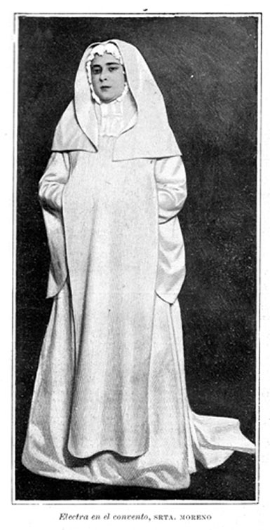Dado el argumento de la obra, bien conocido, puede sorprender el nombre de Electra que encabeza el drama y que al espectador culto le haría evocar las tragedias homónimas de Sófocles y Eurípides. Sin embargo, nos encontramos con una Electra contemporánea, una jovencita hija de padre desconocido, que, tras pasar su primera infancia junto a su madre, vivirá en un convento (Fig. 1) y con diversos parientes, hasta que a sus dieciocho años la acogen sus tíos, personas religiosas y de orden, cuyo amigo Pantoja, personaje oscuro y ultramontano12, que se quiere suponer padre biológico de la muchacha, pretende a toda costa su salvación, que pasaría por estar encerrada definitivamente en un convento. Frente a él aparece la figura luminosa de Máximo, sobrino de los tíos de Electra, joven viudo progresista, dedicado a la ciencia y a los experimentos con la electricidad, del que la joven se enamorará y por el que será correspondida (Fig. 2). Salvador Pantoja, opuesto totalmente al proyecto de un matrimonio entre ambos, llegará a levantar el falso testimonio de que Máximo y Electra son hermanos de padre. La protagonista, enloquecida, ingresará en un convento de donde Máximo, acompañado por su amigo el Marqués de Ronda, la sacará a la fuerza, una vez que Electra no pone impedimento porque se le ha aparecido el fantasma de su madre y le ha asegurado que entre Máximo y ella no hay relación de consanguineidad.