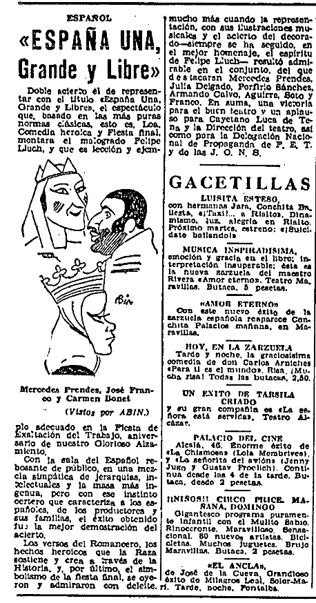 La pregunta que surge es evidente. ¿Pudo un régimen totalitario –al menos en sus primeros tiempos–, surgido de una sangrienta guerra civil, crear un teatro propio?1. La respuesta, como bien afirma Alba Gómez en el artículo que aquí publicamos, es negativa: el Nuevo Estado surgido de la Guerra Civil española no promovió un lenguaje teatral propio, sino que se limitó a censurar y a coaccionar. Lo intentó en un primer momento, con sus manifiestos sobre el “Teatro del Nuevo Estado” y sus concursos de autos sacramentales, pero se reveló absolutamente estéril para semejante cometido. Así que muy pronto hubo de asumir como propio el teatro más conservador que venía representándose con anterioridad a la “Cruzada”, desdiciéndose así de aquellos falangistas de primera hora que arremetían contra él tildándolo de “caduco” e inadecuado a los nuevos tiempos, “gloriosos” e “imperiales”, que habrían de iniciarse a partir de la Victoria (cf. Santos y Muñoz, 2023: 225 y ss.).