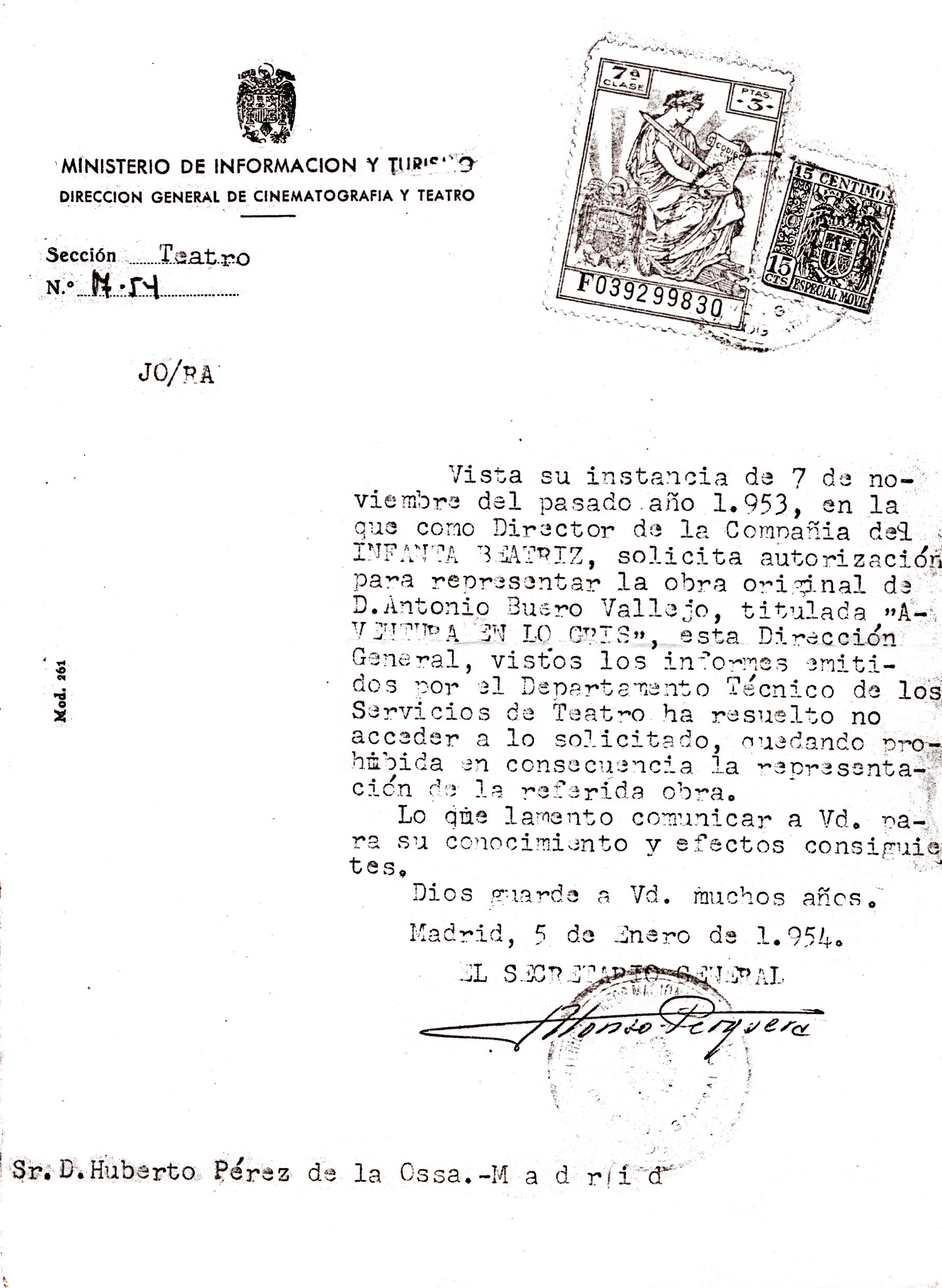 Así pues, una vez asumido el fracaso de crear un teatro propio, el régimen se limitó a cribar aquel que le parecía más aceptable o más conveniente para la imagen que deseaba ofrecer de puertas para fuera, silenciando el que consideraba opuesto a sus ideas. En realidad, por mucho que sus ideólogos proclamaran que el teatro no debía ser política, sino arte, entretenimiento y formación para “el espíritu” (idea recurrente en los informes de los censores), el franquismo nunca perdió de vista la dimensión política del teatro. Buena muestra de ello son los miles de expedientes de censura que se generaron y que hoy se conservan en el Archivo General de la Administración, o el cuidado que se puso en la programación de los teatros oficiales y en la conservación selectiva de su memoria (Santos Sánchez, 2015; Muñoz Cáliz, 2019, 2021a y b). Y por mucho que sus gestores culturales dijeran protegerlo, durante todo el período procuraron instrumentalizarlo y ponerlo a su servicio. Aunque, al menos en parte, también aquí fracasaran, pues nunca en la historia reciente el teatro fue tan crítico, tan mordaz ni tan arriesgado como en los años del tardo-franquismo y la Transición. Pero solo en parte, como decimos, pues sí se consiguió que la mayoría de estas obras fueran completamente desconocidas para el gran público. E incluso que continuaran siéndolo durante muchos años de democracia.