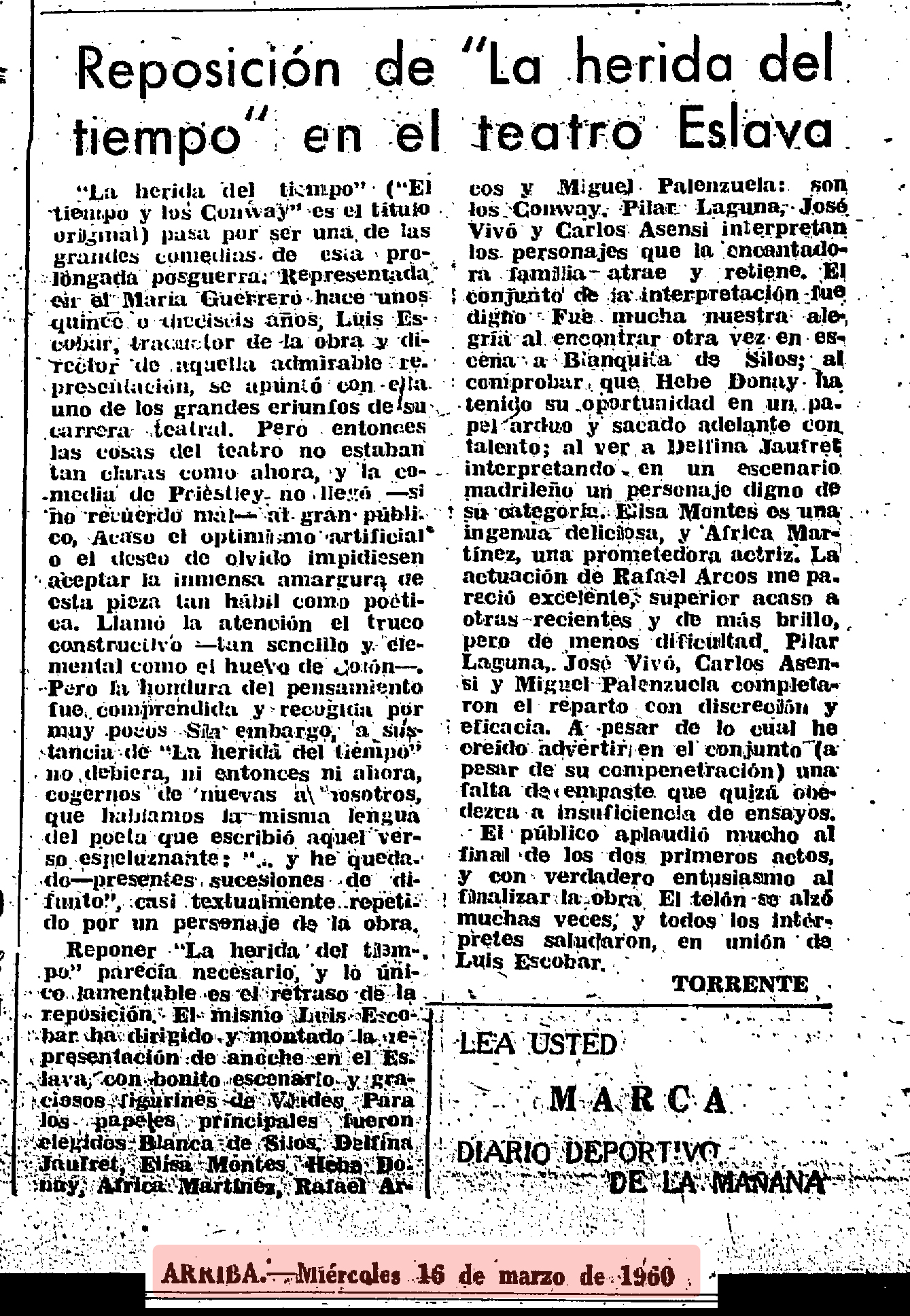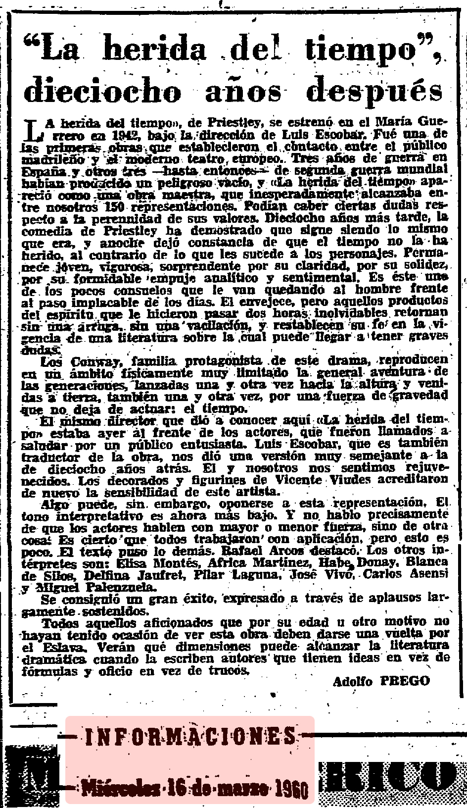 Las palabras de Morera nos recuerdan a las de Torrente Ballester, quien, al comentar la reposición de 1960 de La herida del tiempo, decía que la obra era “una de las grandes comedias de esta prolongada posguerra” (Arriba, 16.3.1960. CDAEM, PRE-1230904) (Fig. 9). Por su parte, Adolfo Prego calificaba la pieza como “obra maestra”. Se trataba, decía, de “una de las primeras obras que establecieron el contacto entre el público madrileño y el moderno teatro europeo” en un momento crucial (“tres años de guerra en España y otros tres –hasta entonces– de Segunda Guerra Mundial (…) habían producido un peligroso vacío”) (Informaciones 16.3.1960. CDAEM, PRE-1608991) (Fig. 10). Sin duda, más de cuarenta años después, persiste el vínculo con el contexto histórico en que surgió el primer estreno del británico Priestley.