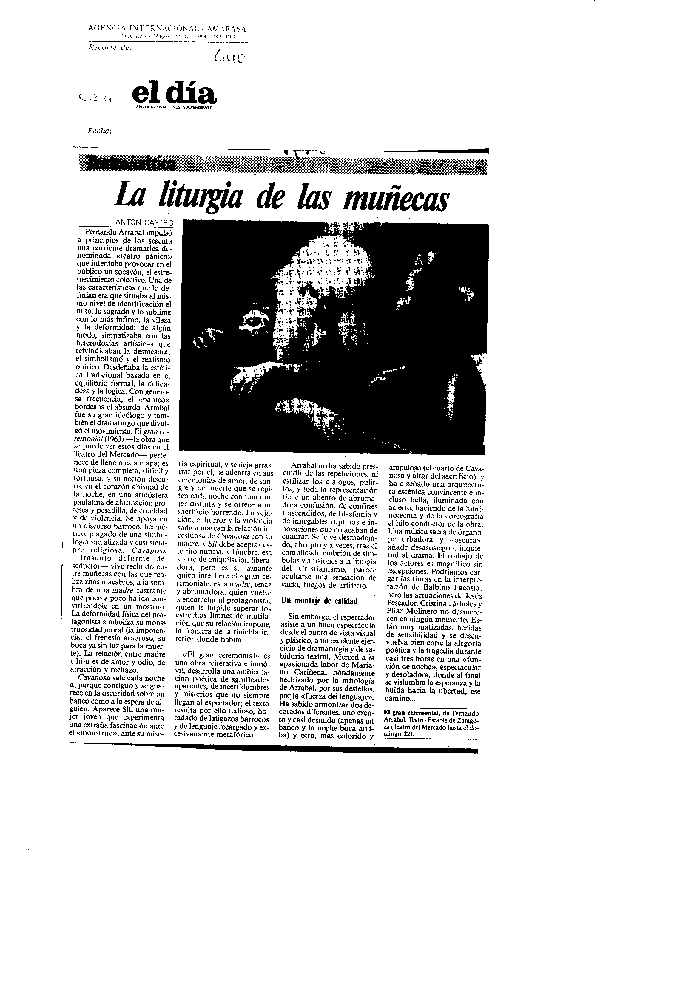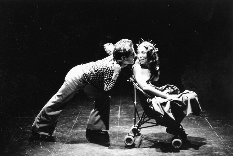 José C. Paulino Ayuso, en su artículo “Modos de presencia de lo sagrado en el teatro español actual”, observa que el Arrabal de sus primeras épocas (los años cincuenta y sesenta) es el “Arrabal iconoclasta, que aprovecha para su teatro el poder irradiante de las imágenes sagradas y de los motivos más característicos de la «novela familiar» psicoanalítica, vinculándolos entre sí de manera estrecha [...]” (Paulino Ayuso, 2002: 242). El propio dramaturgo ve el teatro como una ceremonia, “un banquete sacrílego, erótico y místico, que abarcaría todas las facetas de la vida, incluyendo la muerte, en el que el humor y la poesía, la fascinación y el pánico serían uno” (Taylor en: Arrabal, 1993: 23)2, y propone en El gran ceremonial una impresionante puesta en práctica de esa idea. Su protagonista, Cavanosa3, una grotesca antítesis del arquetipo del amante (es diforme, mentalmente retrasado, descortés, además de virgen), celebra cada noche una ceremonia de sacrificio, que, por su forma y atributos, alude a la Pasión de Cristo, pero es una deformación, grotesca y blasfema del acto. Esta ceremonia transgresora parece ser vista por Cavanosa como un medio de librarse de la obsesiva protección con que la madre le oprime. El hombre, que desea librarse de la dominación de su madre, sueña con marcharse de casa y viajar por el mundo con la mujer de su vida, que iría en un carrito de niño del que él tiraría (Fig. 3). Pero para que ese sueño de libertad se haga la realidad se cree obligado a cometer el matricidio, y como no llega a hacerlo, mata a las mujeres que han de cumplir la función de sustitutas de la víctima a que es incapaz de sacrificar. Las seduce en el parque situado frente a su casa y, cuando las ve lo suficientemente pecadoras como para cumplir la función de chivo expiatorio cuyo sacrificio le permitiría romper el círculo vicioso cuya forma ha tomado su vida, y escaparse del espacio materno hacia el de una mayor libertad, las lleva a su casa familiar.
