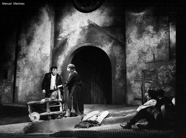 Decorados y figurines de Emilio Burgos, acusan un minucioso estudio del “canón” [sic] estético del paisaje y la ciudad gallegos. Los intérpretes manejados por Tamayo con apasionamiento y firmeza, sirven la obra sin caer en composiciones de tarjeta; pero, al mismo tiempo, sin olvidar un cierto regusto –muy en la prosa de Valle– por la composición y por la plástica. Tamayo ha cuidado con fortuna los ritmos y no ha vacilado en mantener la liturgia escénica que Divinas palabras demandaba. No se olvida el amor al misterio encerrado en una máxima de Valle: “Todas las voces misteriosas, explicadas, dejan de oírse” (La Marquesa Rosalinda), conjugado con la violencia pasional y explícita de Mari Gaila y el Compadre Miau y con la furia que ambos desatan en las últimas escenas. Crear este clima de falso pudor, de falsa caridad, de falsos romeros y falsa resignación, e insertar en él el mundo carnal y cierto de Mari Gaila, he aquí un trabajo esencial al que se ha aplicado la dirección.