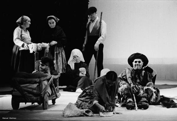 El primer intento de montar Divinas palabras en el Teatro Español había fracasado (Monleón, 1971), y Tamayo emprendió, con su Compañía Lope De Vega, la tarea de representarlo en el Bellas Artes como espectáculo inaugural, veinticinco años después de la muerte de Valle-Inclán [fig. 1] [fig. 2]. El proyecto está avalado por la pluma de Gonzalo Torrente Ballester, que se encarga de la versión (o de la refundición, según indica el propio Tamayo, en Monleón, 1971b). En el dossier del número 28 de Primer acto dedicado a Divinas palabras, Torrente ofrecía un perfil de Valle-Inclán muy personal, por no decir un tanto desenfocado, en el que la obra del arosano se hacía pasar por el filtro de un realismo casi costumbrista (y no por el de lo expresionista o lo grotesco goyesco), y su estética se decía anclada en la ternura, comicidad e incluso “caridad cristiana” (“la vía cristiana del perdón”, 1968, 5) de los personajes1.