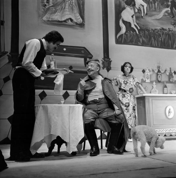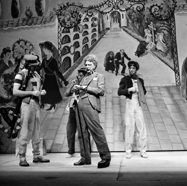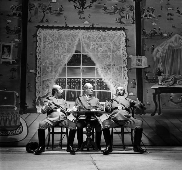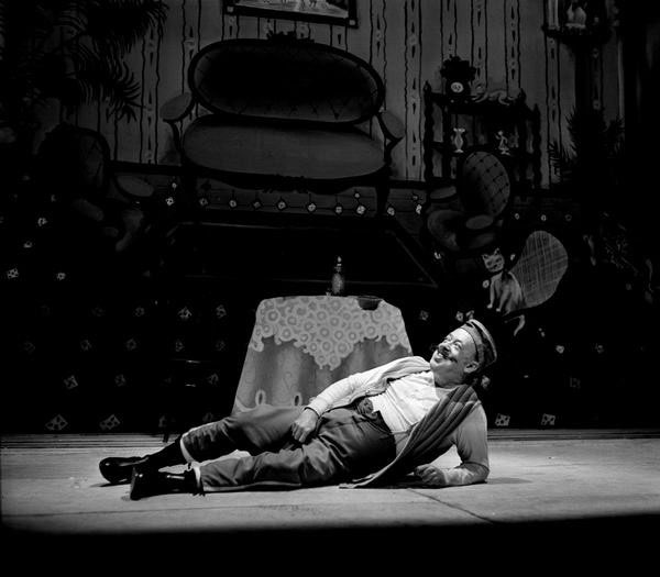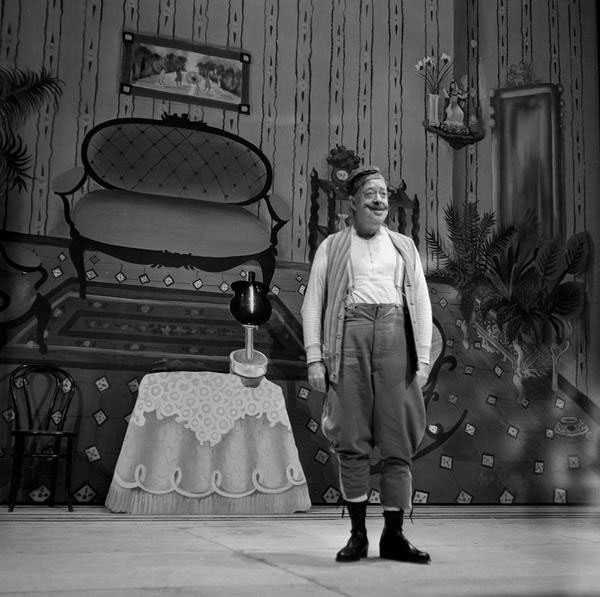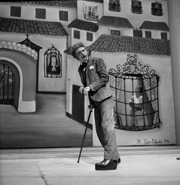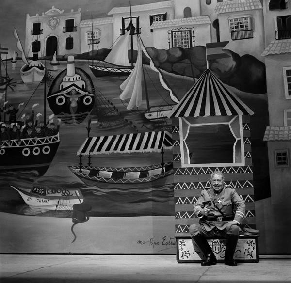 Tamayo continúa su itinerario valleinclaniano con Los cuernos de don Friolera, que no alcanzaría la repercusión crítica de los montajes anteriores, aun siendo la primera vez que esta obra llegaba a los escenarios comerciales3 [fig. 28]. El mismo día del estreno, el periódico ABC (25 de septiembre de 1976) incluía una entrevista de Ángel Laborda con Tamayo, que definía la obra en estos términos: “Valle nos sitúa ante un mundo desconcertante donde la tragedia y la farsa marchan paralelos”. Defendía, sin embargo, su puesta en escena a partir de “una solución pictórica” en la que se acude al “naïf ilusionado” de la pintora malagueña Mari Pepa Estrada [fig. 29]. El mismo periódico publicaba el 28 de septiembre la crítica de Lorenzo López Sancho (1976), que calificaba la pieza como “obra maestra” del género del esperpento. Comparaba López Sancho Los cuernos… con el teatro de Brecht, con la pintura de Van Eyck (El matrimonio Arnolfini) o Velázquez (Las Meninas), con la literatura de André Gide (Los falsos monederos) por el uso de la “reduplicación de la imagen”, lo que hoy llamaríamos mise en abyme, que en la obra de Valle-Inclán se plasma en una forma multiperspectivística que permite satirizar una España en descomposición, ridícula, fantochesca. Tamayo ha anulado parte de esa estrategia suprimiendo el romance de ciegos final; se ha mantenido fiel a las acotaciones, respetando la guiñolización de los personajes, aunque el personaje de don Friolera (Antonio Garisa) “ha sido humanizado hasta cierto punto, lo que regenera o, dicho de otro modo, atenúa su ridiculización de antihéroe buscada por el gran escritor”. La estética naïf de Estrada fue acertada, porque se ajustaba a la idea de cartelones de ciego, pero por momentos acusaba cierta desviación zarzuelesca. También criticaba López Sancho unos figurines “anacronizados, como ocurre con los de los matuteros, que parecen más bien chulos madrileños de época anterior que contrabandistas andaluces”, o con el monigote de Pachequín (Juan Diego), “tratado con algún exceso”. Por otra parte, el lenguaje de Valle-Inclán se resentía, y muchas de las referencias históricas o intertextuales (Echegaray o Calderón) a las que se alude en el diálogo eran extrañas para el espectador contemporáneo, con todo capaz de establecer interesantes paralelismos con la época actual. Garisa está genial como actor cómico, y Juan Diego adecua su papel al perfil guiñolesco requerido por Valle-Inclán [fig. 30].