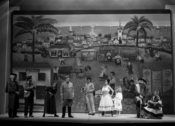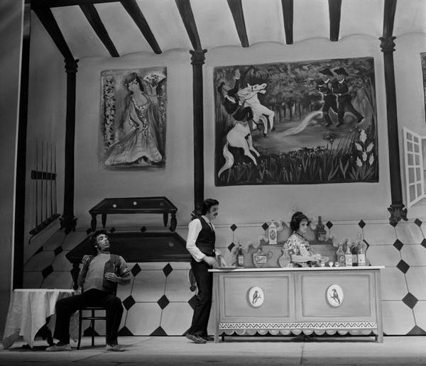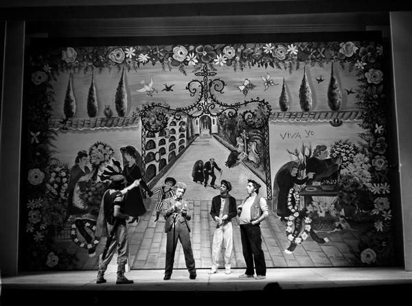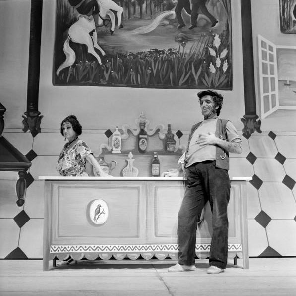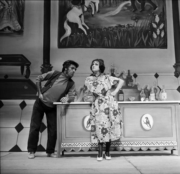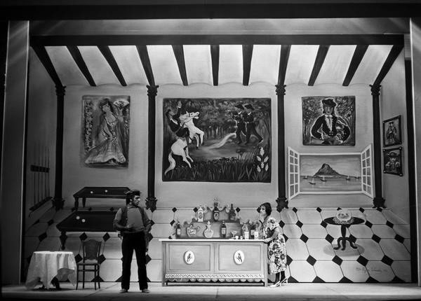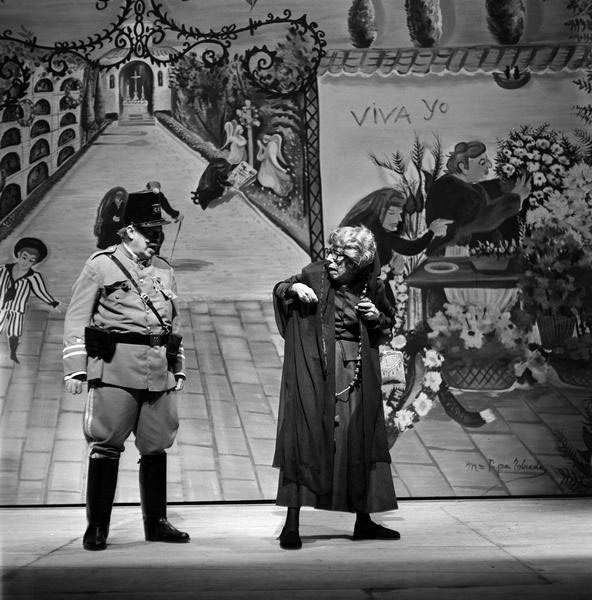 Pablo Corbalán, desde las páginas de Informaciones (28 de septiembre de 1976), dedicaba más de la mitad de su crónica a introducir la genialidad de Valle-Inclán y a situar dentro de su particular estética del esperpento o del “fantochismo” de Los cuernos de don Friolera, “una de las piezas más recias y sorprendentes de la dramaturgia moderna”. Sobre el espectáculo apenas se nos dice que “Tamayo ha montado Los cuernos… respetando y acentuando el tópico andaluz en que la acción se sitúa, y subrayando en toda su variedad el desarrollo cinematográfico de ésta”. Se trataba de un montaje “espléndido” (“uno de los más brillantes y superadores espectáculos que hayamos visto y escuchado en los últimos años”) sobre todo en la colaboración pictórica de María Pepa Estrada, “quien ha resuelto la plasticidad valleinclanesca por el procedimiento naïf”, y en los figurines de Víctor María Cortezo. Destacaba la interpretación de Juan Diego, “fantoche puro, aspaviento y retranca”; Antonio Garisa, llena de matices; y Mary Carmen Ramírez, “plena de desplante, instinto encendido y populachismo” [fig. 32].