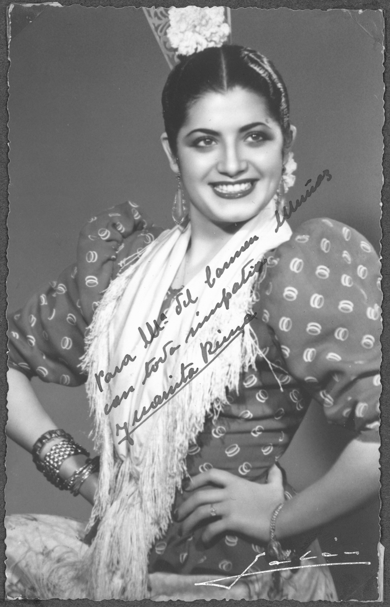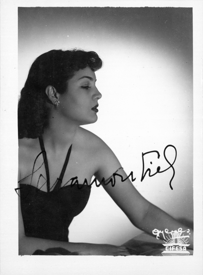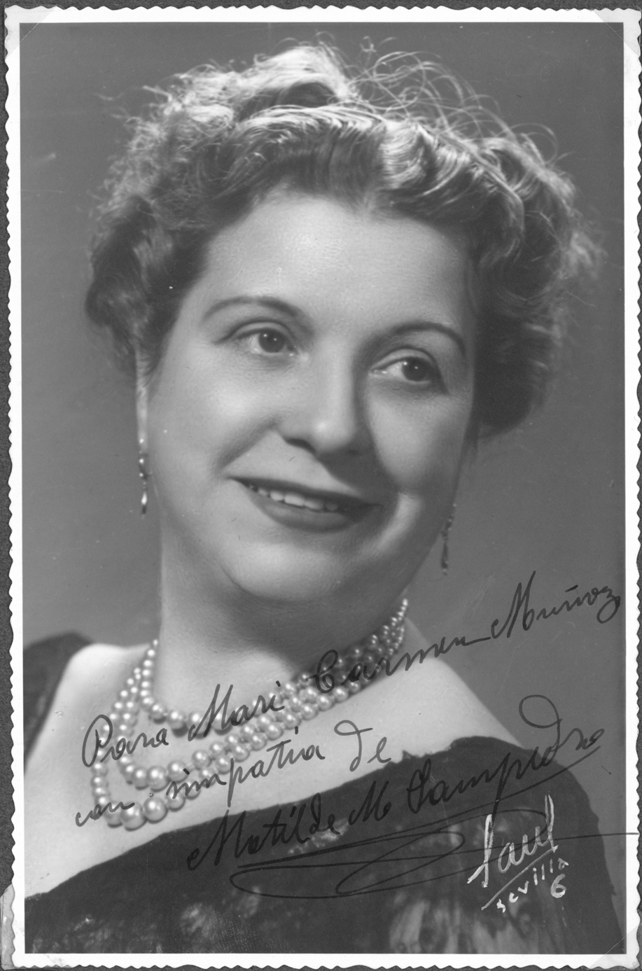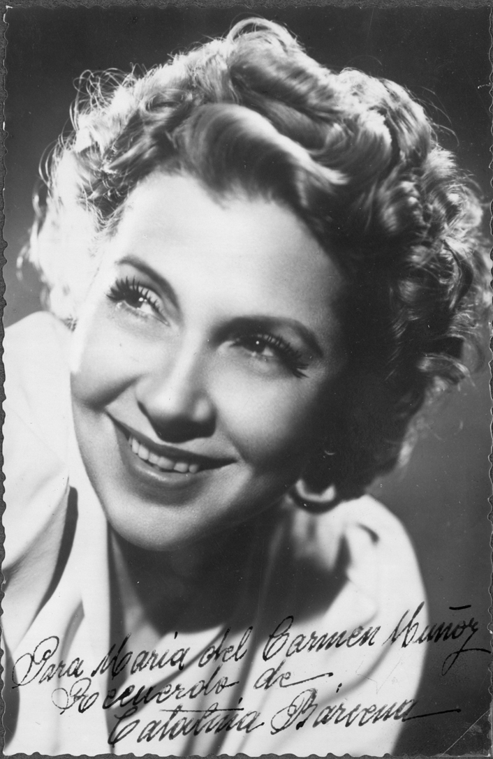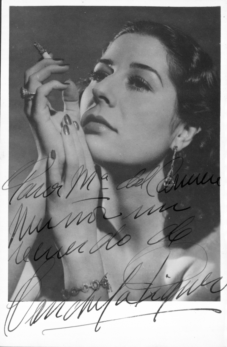 Entre las pertenencias de Carmina Muñoz había otro tesoro: durante años, esta mujer había coleccionado fotografías dedicadas de artistas de teatro, música, danza, títeres, circo y cine. En nuestro libro Cincuenta años del Centro de Documentación Teatral, en sus páginas 292 y 293, se pueden ver 33 fotografías de este fondo. Dejamos en esta nota 18 fotografías que dan una idea de la riqueza y variedad de la colección: Amparo Rivelles, Ángel de Andrés, Ava Gardner, Catalina Bárcena, Conchita Piquer, Edward G. Robinson, Fernando Fernán-Gómez, Jorge Negrete, José María Rodero, Juanita Reina, Manuel Dicenta, María Félix, Mario Cabré, Matilde Muñoz Sampedro, los payasos Pototo y Boliche, Raquel Meyer y Sara Montiel. Incluimos también una fotografía de Carmina Muñoz: en ella están representadas todas esas personas que sostienen estas artes con su pasión de espectadores.