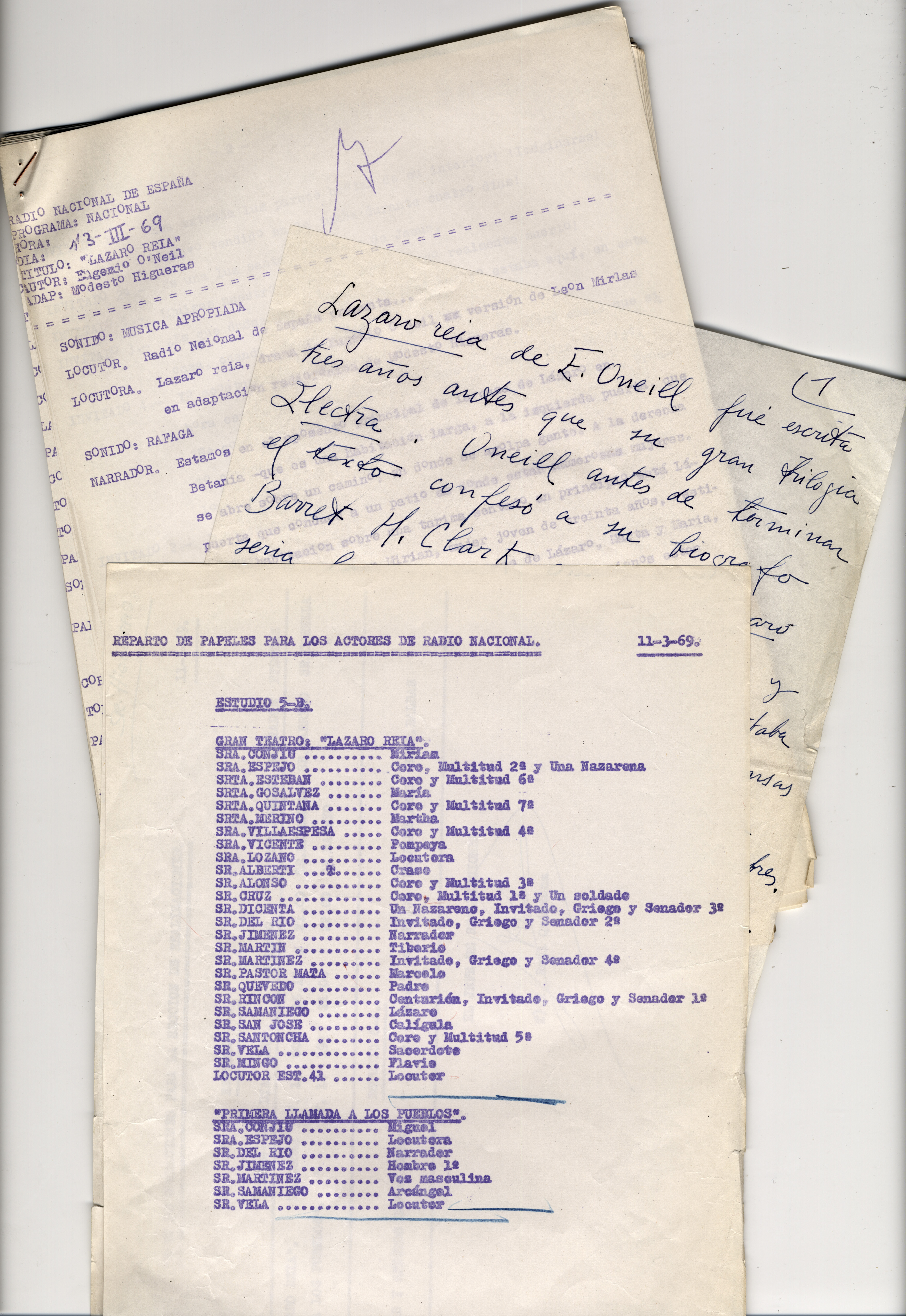 El Foco presenta un ejemplo de estos guiones: Lázaro reía (emitida en 1969), de Eugene O'Neill, junto al manuscrito introductorio del propio Modesto Higueras, así como el reparto de papeles para los actores de Radio Nacional, entre quienes encontramos a famosos actores vinculados al medio radiofónico como Rafael Samaniego, Lola Villaespesa, Elena Espejo, Aurora Vicente, Enrique Rincón, José María del Río, José Santoncha, Aníbal Vela o Pablo Jiménez. En la primera fotografía, también perteneciente al legado, aparece Modesto Higueras sujetando unos papeles, junto a Lola Villaespesa, primera por izquierda y a José María de Rio (?), en el centro.