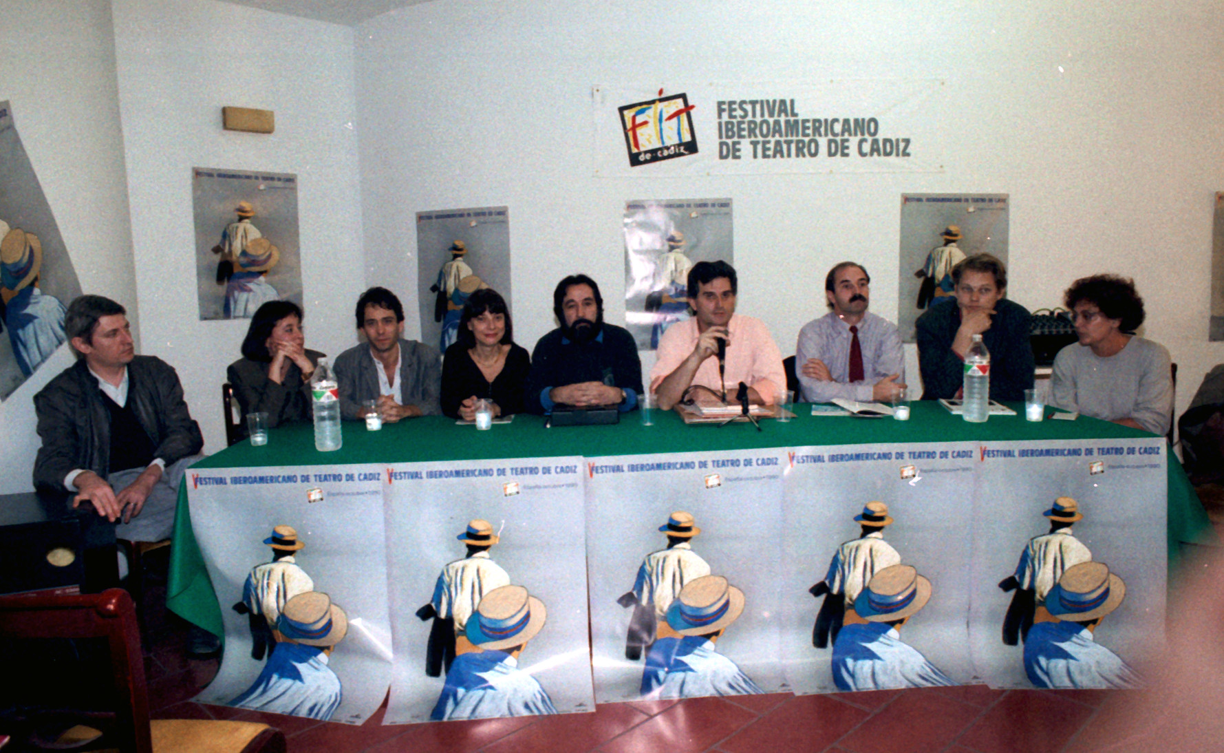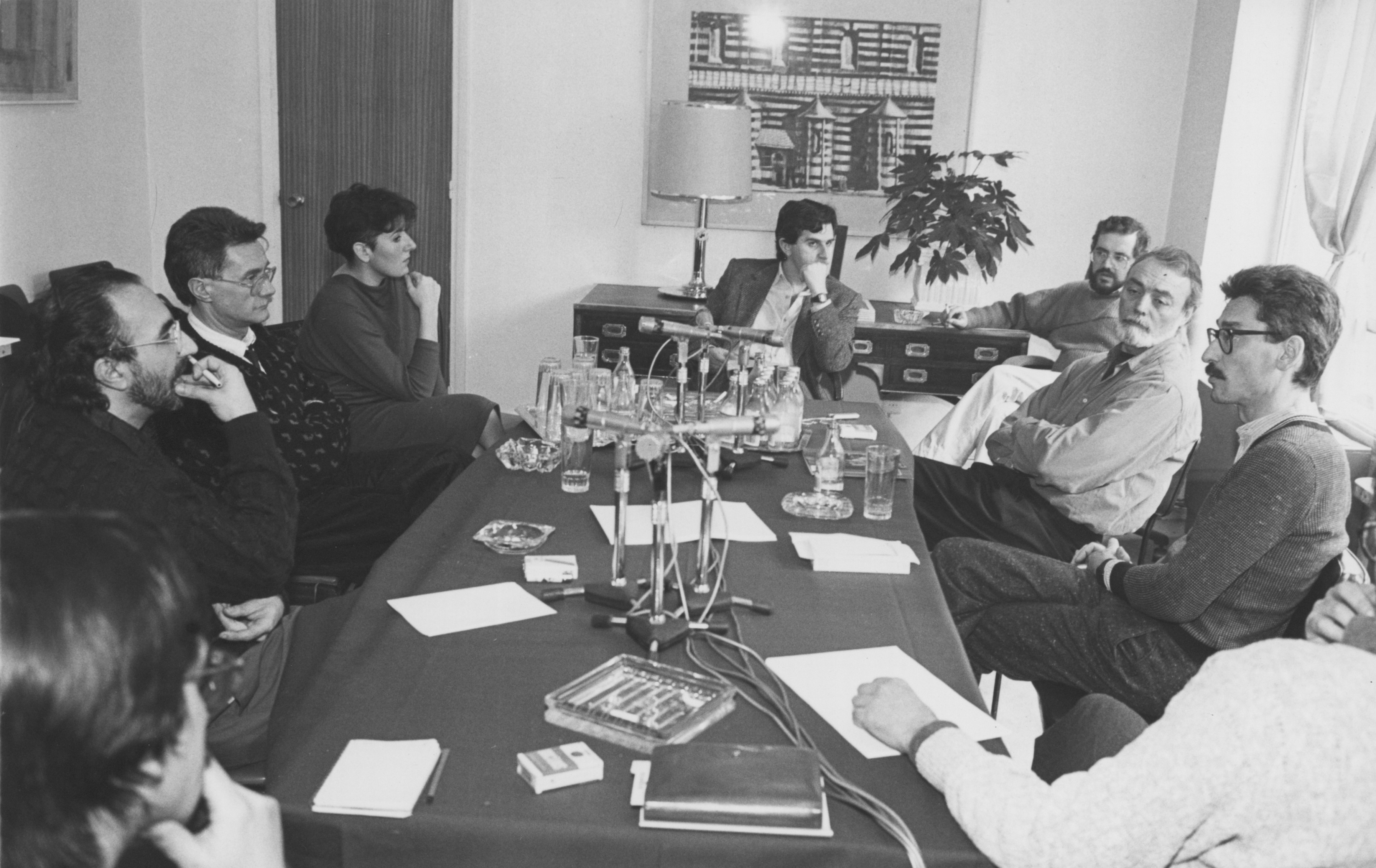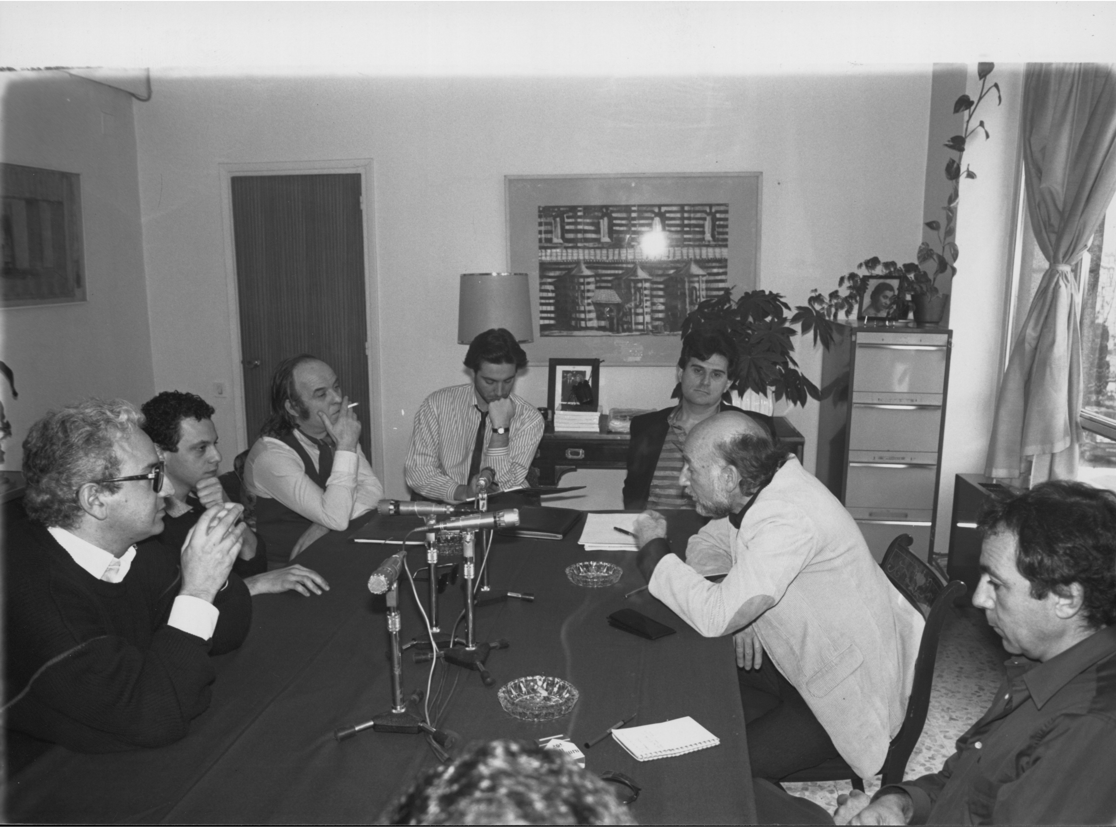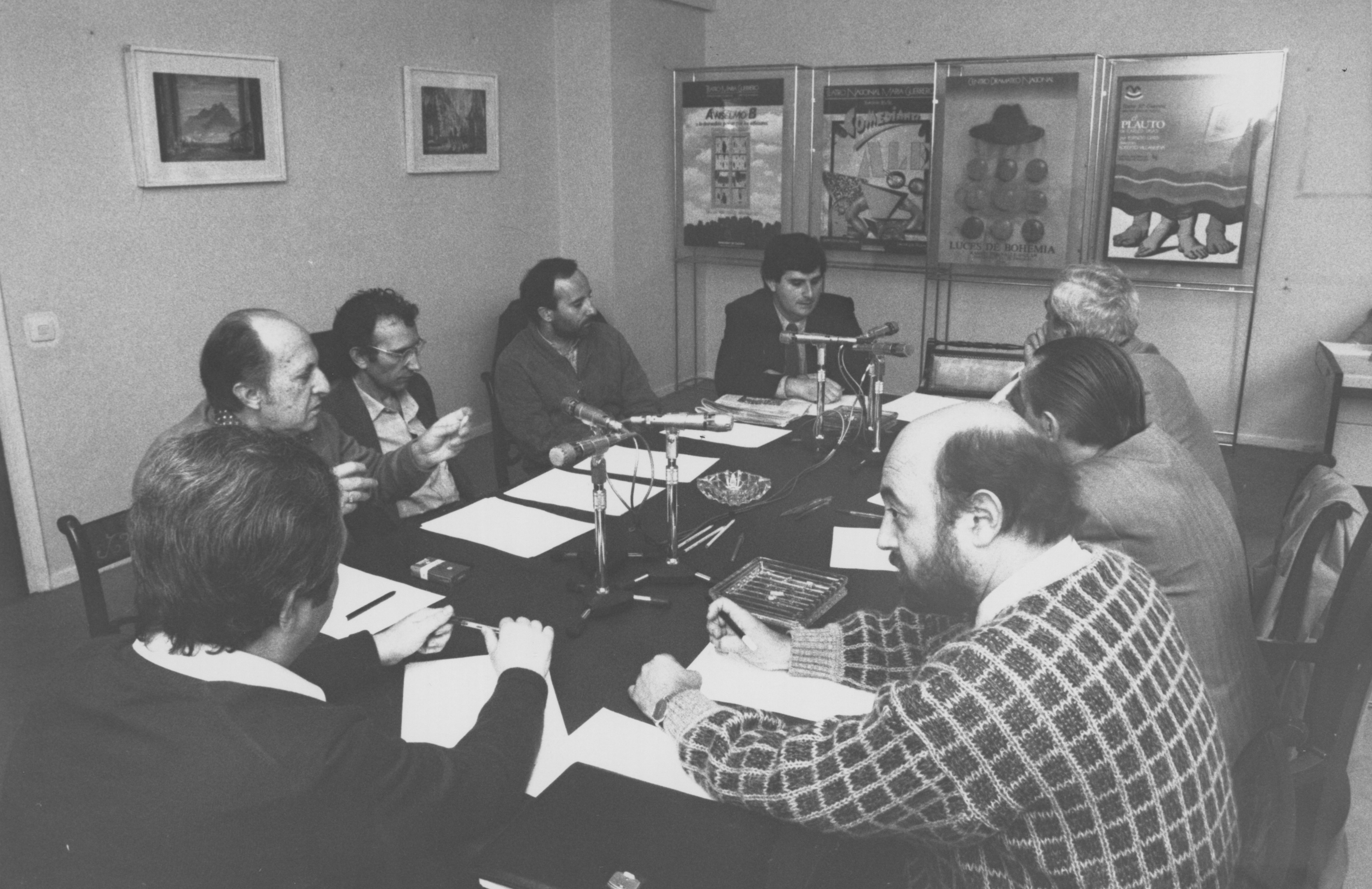En una reunión con directores de escena, junto a José Carlos Plaza, Lluís Pasqual, Ángel Facio, Adolfo Marsillach y José Luis Gómez, más el periodista Juanjo Guerenabarrena.